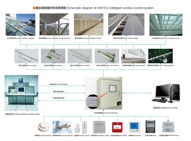 智能通風(fēng)控制系統(tǒng)由智能控制箱、墻裝開關(guān)、遙控器、風(fēng)雨感應(yīng)器、開窗器等組成,用戶可根據(jù)日常室內(nèi)環(huán)境的變化,通過遙控器或者開關(guān)來對(duì)窗戶進(jìn)行開啟和關(guān)閉的控制。